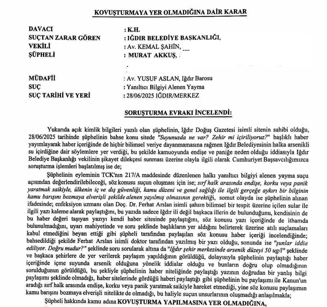 “Paylaşılan söz konusu haber içeriği incelendiğinde; bahsedildiği şekilde Ferhat Arslan isimli doktor tarafından yazılmış bir yazı olduğu, sonunda ise "şunlar iddia ediliyor. Doğru mudur?" şeklinde soru sorularak altına da "Iğdır şehir merkezinde arsenik düzeyi 50 ug/l" şeklinde ve başkaca şehirlere de yer verilerek paylaşım yapıldığının görüldüğü,